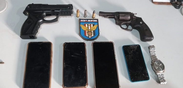 Em ato contínuo a guarnição visualizou os indivíduos, passando a fazer o acompanhamento tático vindo a interceptá-los próximo ao condomínio Pitangueiras. Durante a busca pessoal, nos suspeitos foram localizados celulares, mochilas com outras roupas (fardas), relógio e ainda duas armas de fogo, sendo um revólver calibre 38 com quatro munições, sendo uma deflagrada e um simulacro de pistola. Eles estavam em uma motocicleta POP 110 na cor branca que também haviam roubado momentos antes de praticarem o assalto.