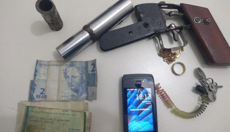 Durante a abordagem ao coletivo, a dupla que foi identificada como sendo dois adolescentes de 17 e 16 anos respectivamente, tentaram dispersar uma arma de fogo de fabricação caseira cal. 12 pela janela do ônibus, sem êxito.