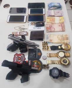 Além das armas foram apreendidos ainda 04 aparelhos celulares da marca Samsung, um outro da Motorola; 04 relógios de diversas marcas e a quantia em espécie de R$ 367,50.