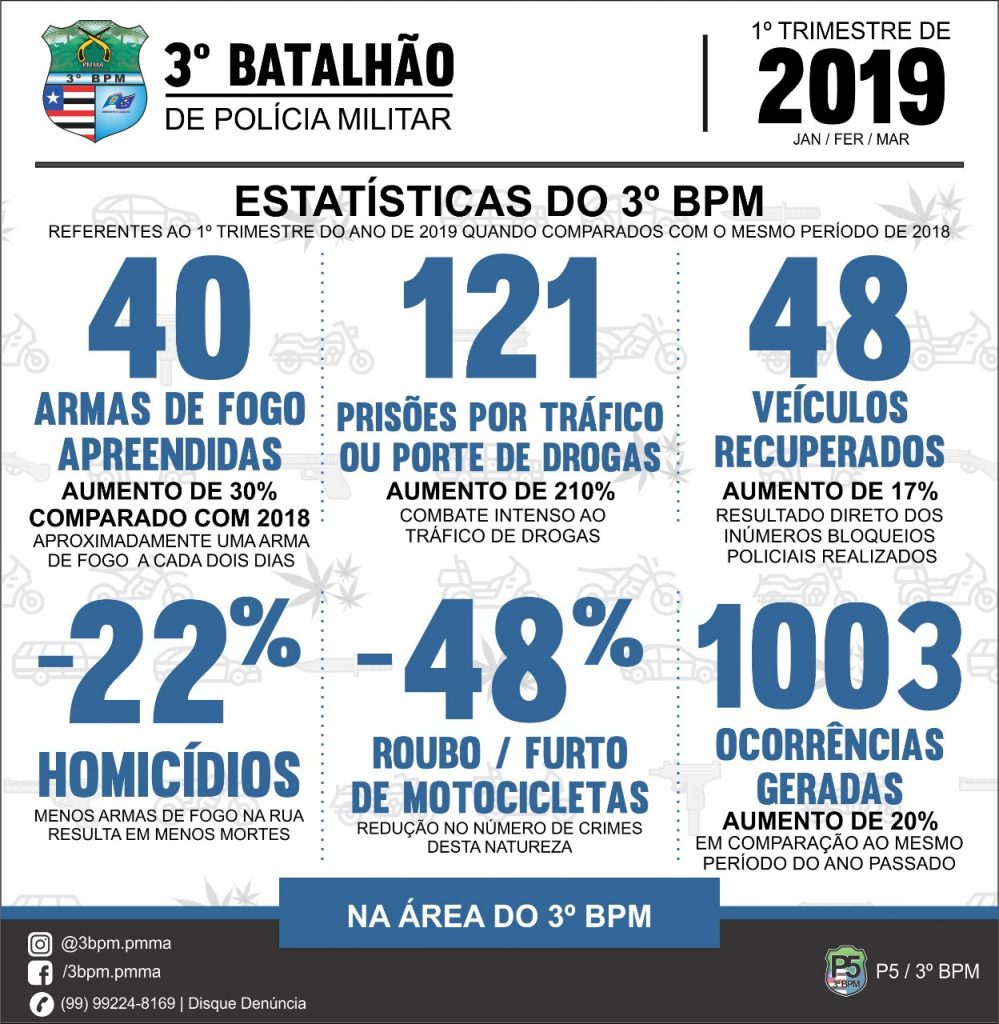 O primeiro trimestre de 2019, em comparação com o ano de 2018, é considerado positivo pelo Comando do 3° BPM, Unidade Policial situada na cidade de Imperatriz, a segunda maior cidade do Estado do MA. Tal fato se evidencia visto que todas as tipificações criminais apontaram reduções nesse período, destacando-se os delitos de homicídios que sinalizam uma diminuição de 22%, de roubos e furto a motocicletas com redução de 48% simultaneamente.