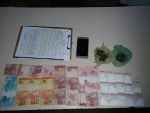 Dando continuidade aos trabalhos a guarnição do Santa Rita em abordagem a um veículo táxi, por volta das 03h30 a busca pessoal no indivíduo que estava na condição de passageiro, encontrando com o mesmo várias substâncias semelhantes a droga e R$270,00 em espécie no bolso. O suspeito foi apresentado no Plantão Central sem lesões corporais para as providências cabíveis.