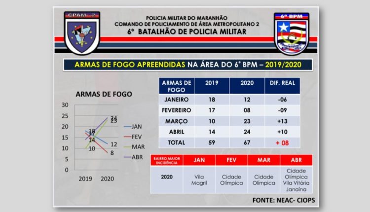 O 6° Batalhão de Polícia Militar, importante unidade policial da capital , subordinada ao comando de policiamento Metropolitano 2 , CPAM-2, fechou os primeiros quatro meses de 2020 com 67 armas de fogo tiradas de circulação O que representa um aumento de13,55 % na, produtividade se comparado com o mesmo período do ano passado. Esses números expressivos de apreensões de armas se traduz em mais prevenção e segurança a todas as comunidades na qual está sob a jurisdição deste batalhão.
