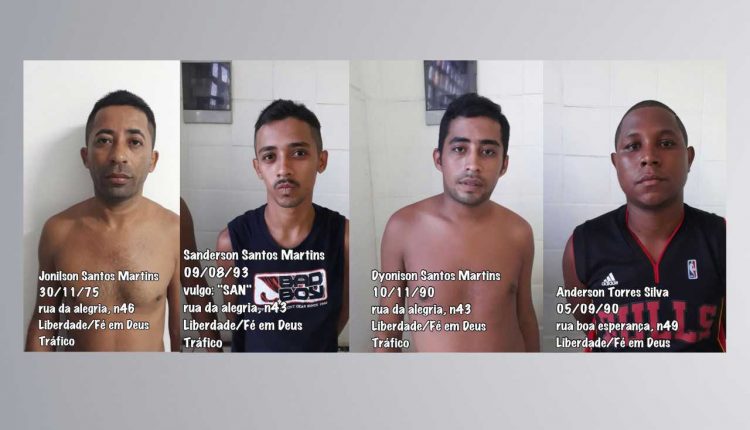 O 9°BPM, por meio do GSA, prendeu na tarde da última segunda-feira (28), os nacionais Jonilson Santos Martins, 41 anos, Sanderson Santos Martins, 24 anos, Dyonison Santos Martins, 26 anos, Anderson Torres Silva, 26 anos. Todos são pertencentes a uma mesma família que traficava drogas no bairro da Liberdade.