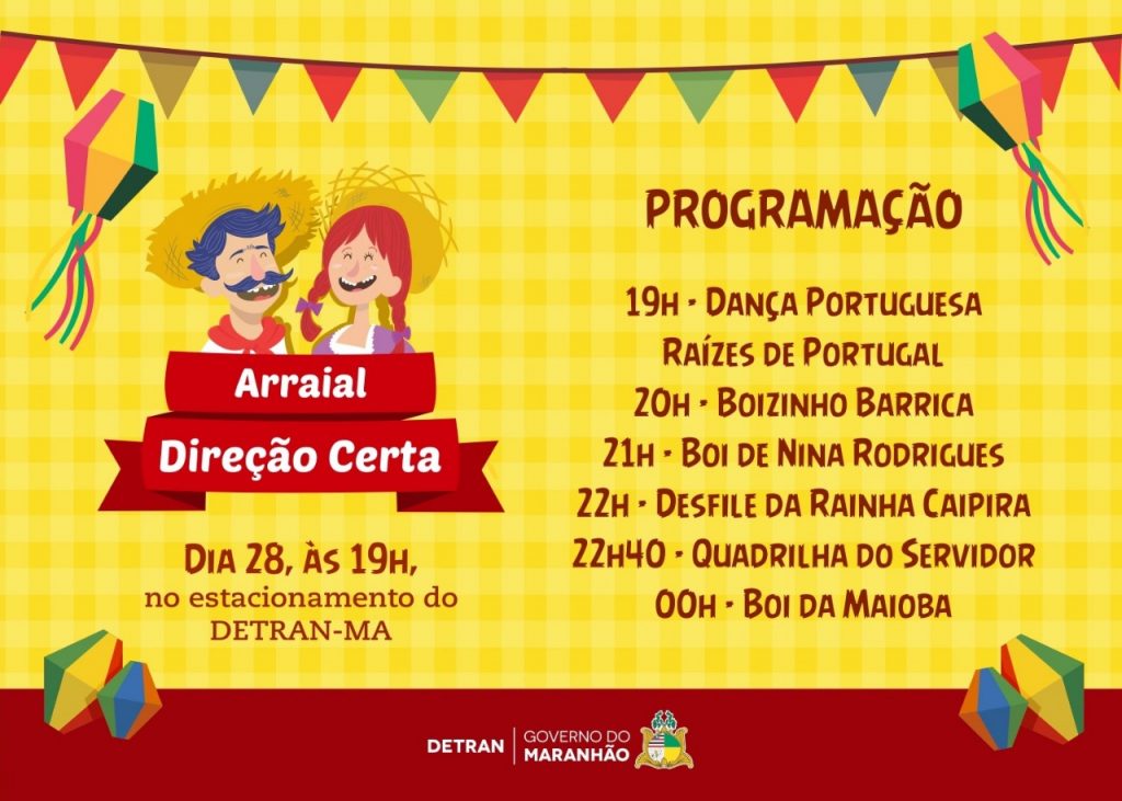 O Secretário de Segurança Pública Jefferson Portela e a Diretora do Detran Larissa Abdala participaram do arraial Junino, realizado no Detran. O Detran inovou neste ano, com um araial com apresentações significativas. Na oportunidade foram apresentadas diversas brincadeiras, dentre elas, o Bumba meu Boi de Nina Rodrigues; a Quadrilha dos servidores do Detran; Boizinho Barrica; Desfile da Rainha Caipira; Dança Portuguesa Raízes de Portugal; Boi da Maioba e demais apresentações.