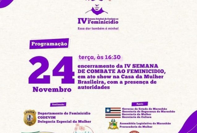 Priorizando nas ações preventivas contra os crimes de feminicídio, a Policia Civil do Maranhão realiza um ato Show em homenagem às vítimas de Feminicídio. Nesta terça-feira (24), será realizado o encerramento da IV Semana Estadual de Combate ao Feminicídio na Casa da Mulher Brasileira. IV SEMANA DE COMBATE AO FEMINICIDIO!!! O evento encerará nesta terça-feira, às 16:30h, na Casa da Mulher Brasileira, no Jaracaty.