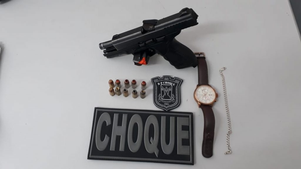 Ao adentrarem o local, a equipe logo encontrou Joel Colins de Oliveira, 31 anos, no qual tentou empreender fuga sem sucesso. Com ele foi encontrado uma pistola Taurus ZSH 83124, cal. .40 de uso da Polícia Civil do Maranhão contendo um carregador com 10 munições intactas além de, um relógio dourado e uma corrente prateada.