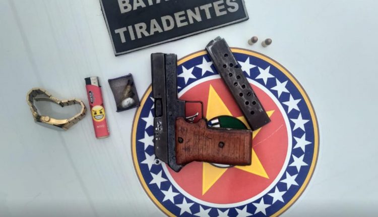 Policiais do Batalhão Tiradentes prenderam dois homens em posse de uma arma de fogo que haviam acabado de realizar um roubo em uma parada de ônibus. A equipe realizava o patrulhamento ostensivo quando foram acionados por populares do ocorrido.