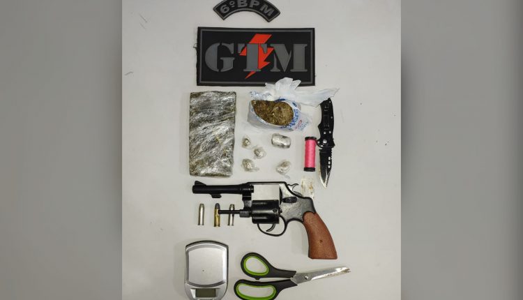 Os policiais realizaram busca no ambiente e encontraram quantidade significativa de substância vegetal semelhante à maconha, um revólver calibre 38 com três munições intactas de mesmo calibre , uma balança de precisão, material para embalagem como tesoura, lâmina, canivete e linha.