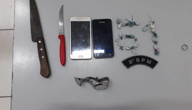 Após ter autorização para entrar no condomínio, a guarnição se deparou com outro suspeito, menor de idade, que permitiu a entrada dos policiais em um dos apartamentos, onde foram apreendidos 13 papelotes de um produto similar a cocaína, duas armas brancas e dois aparelhos de celular.