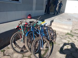 Com a dupla a PM encontrou 01 (uma)motocicleta pop100, cor branca, placa psh5265, tomada de assalto; 01(um)arma de fogo de fabricação artesanal; 01(um)uma bike cor azul, marca monarck; 01(uma)bike vermelha, marca caloi;01(uma)bike preta ,marca monark; 01(uma)bike cor verde, monark.