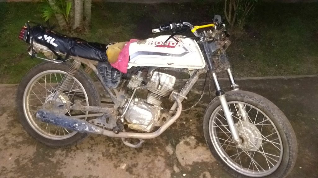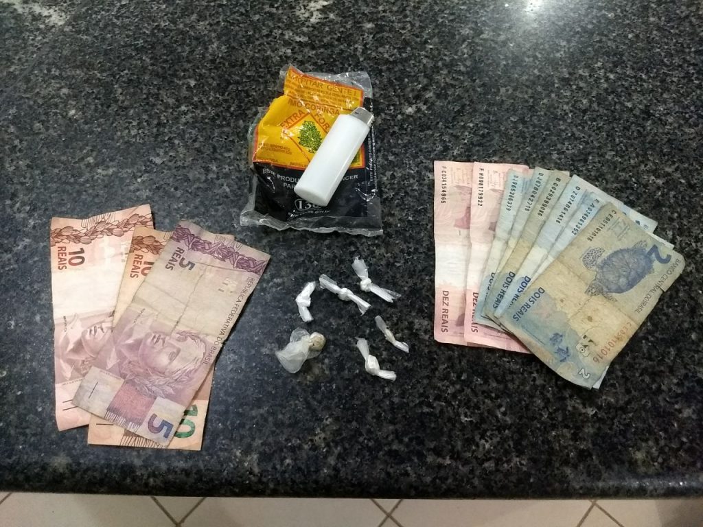 Policiais Militares da Equipe Águia durante as rondas rotineiras nas ruas do bairro Conjunto Nota 10, observaram os cidadãos Josael Alves de Melo e Raí Junior do Nascimento Oliveira em atitude suspeita. Ao realizar uma abordagem a dupla, a guarnição encontrou cinco porções de uma substância semelhante a crack, uma quantia em dinheiro em espécie e uma motocicleta Honda branca sem documentação.