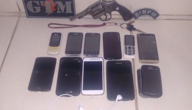 Em resposta os policiais revidaram a agressão sofrida e começaram a disparar contra os criminosos. Quando em seguida o piloto da motocicleta perdeu o controle do veículo. Que ao se aproximarem do suspeito “Caburéu” foram encontrados um revolver cal. 38, marca TAURUS, numeração 385220, com 05 capsulas deflagradas e que no interior da mochila que estava com o mesmo foram encontrados 11 (onze) aparelhos celulares de diversas marcas.