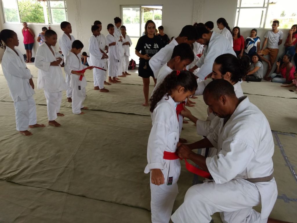 Ao final, 27 alunos mudaram de faixa, sendo: 11 alunos da faixa branca para amarela; 08 da amarela para vermelha; e 08 da vermelha para laranja.