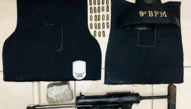 No interior do local foi encontrado 01 submetralhadora Guide, modelo M3 em calibre 45; 23 munições 45; 01 colete balístico e 01 porção aproximadamente de 400g de uma substância semelhante a maconha.