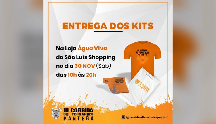 Devido a grande procura para a III CORRIDA SD FERNANDES PANTERA, disponibilizamos mais alguns Kits. As inscrições serão no *dia 30 de Nov (sáb) das 10h00 às20h00* no Shopping São Luís na Loja Água Viva.