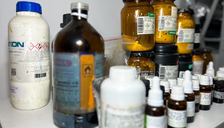 No interior do imóvel, os agentes encontraram matérias-primas vencidas desde 2019, entre elas substâncias como canabidiol, além de medicamentos injetáveis e cilindros de gases médicos, armazenados de forma irregular, sem condições adequadas de higiene ou segurança. O espaço apresentava risco de incêndio e explosão por conter materiais inflamáveis e não possuía certificado do Corpo de Bombeiros.