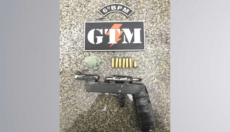 No interior da residência a polícia deu início ao processo de vistoriamento, e conseguiu apreender uma arma de fogo de fabricação caseira, além disso foram encontradas 6 munições intactas e uma porção de maconha.