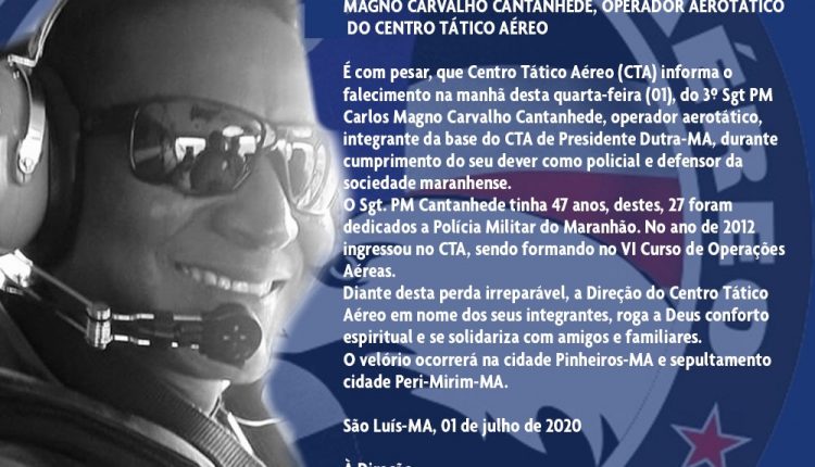 É com pesar, que Centro Tático Aéreo (CTA) informa o falecimento na manhã desta quarta-feira (01), do 3º Sgt PM Carlos Magno Carvalho Cantanhede, operador aerotático, integrante da base do CTA de Presidente Dutra-MA, durante cumprimento do seu dever como policial e defensor da sociedade maranhense.