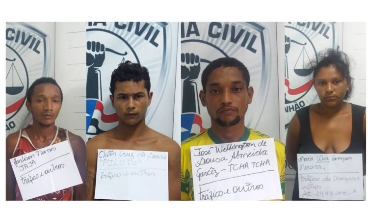 A Polícia Civil através da 8ªDelegacia Regional de Zé Doca em trabalho conjunto com a Polícia Militar do Estado do Maranhão, deflagrou na manhã desta sexta-feira (30), uma operação que resultou nas prisões em flagrante dos nacionais Jarlison Nunes “Jajá” (28), Maria Célia Campos Moreira MARIA CÉLIA CAMPOS MOREIRA (31), Cleiton Cruz de Sousa ‘Piloto” (20) e José Wellington de Sousa de Almeida Garcez (24). O quarteto é suspeito pelos crimes de tráfico, associação para o tráfico de drogas, corrupção de menor, posse de arma de fogo, receptação e formação de quadrilha na cidade de Nova Olinda do Maranhão.