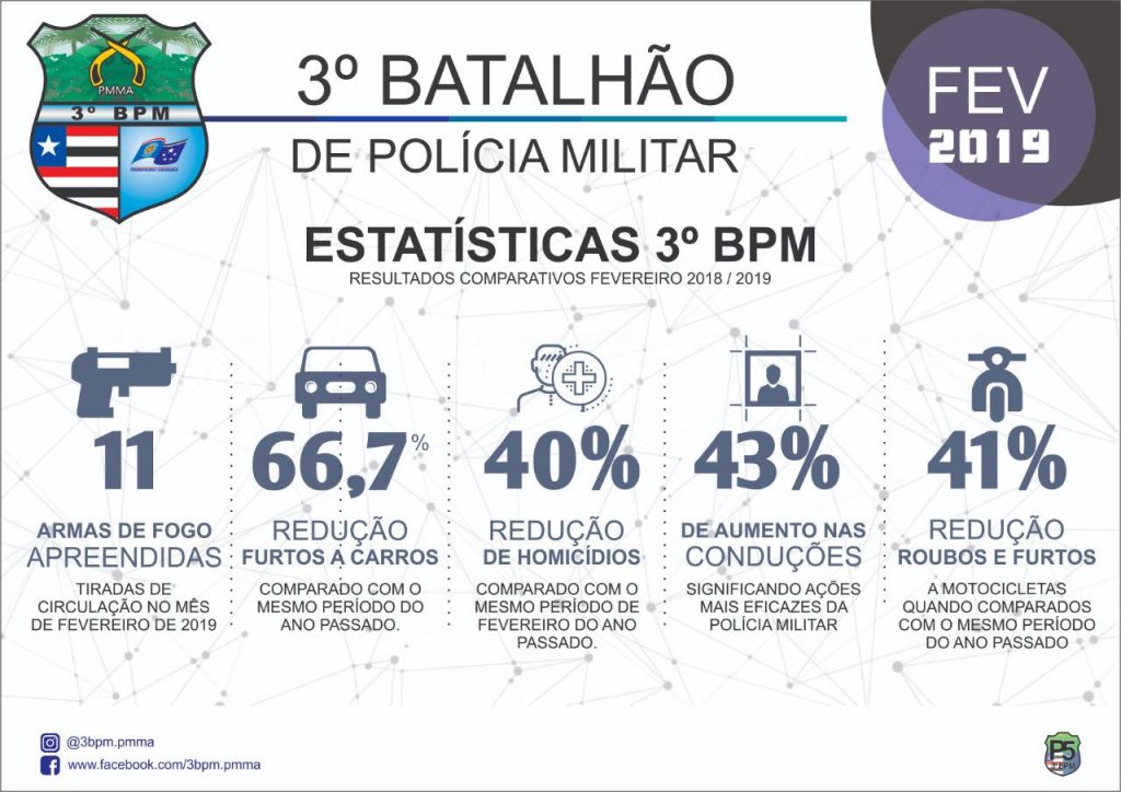O mês de fevereiro de 2019 registrou o menor número de homicídios dos últimos anos em Imperatriz. Foram apenas dois homicídios por arma de fogo na área do 3º Batalhão de Polícia Militar, representando uma redução de 40% se comparado a fevereiro de 2018.