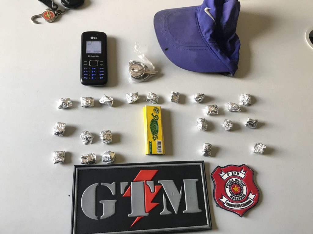 Em mais uma prisão na manhã desta quarta-feira (21), por volta das 08:30hs, o 9° BPM por intermédio da equipe Gtm , prendeu o nacional Afonso da Silva Reis, 20 anos. O suspeito foi preso pela equipe em rondas pelo bairro João de Deus, fazendo policiamento ostensivo pelo endereço acima citado, onde é costumeiro o tráfico de drogas, sendo que os mesmos sempre conseguiam fugir da guarnição, quando de imediato a equipe fez o cerco e mesmo assim o suspeito tentou fugir do local se desafazendo de um objeto, jogando-o ao mato, sendo que de imediato os policiais lograram êxito na captura, e logo foi constado que o objeto atirado se tratava de todo o material abaixo apresentado.