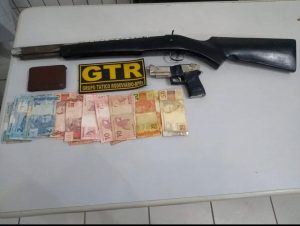 Na oportunidade, foi encontrado junto aos 4 ocupantes do veículo, sendo 2 deles menores de idade, uma arma de fogo cal12 e um simulacro, estando a vítima no interior da mala.