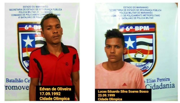 Polícia Militar do Maranhão por meio do 6º Batalhão, no comando do Major Marcelo, prendeu na última terça-feira (30), por volta das 6h10, no bairro da Cidade Olímpica os indivíduos Edvan de Oliveira (26) e Lucas Eduardo Silva Soares Bosco (19) pelo crime de roubo qualificado pelo emprego de arma e pelo concurso de pessoas.