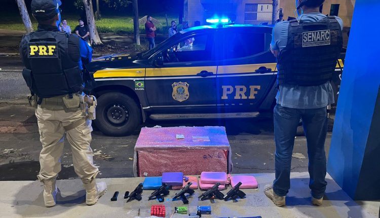 Além dos entorpecentes, os policiais encontraram outra bagagem no compartimento inferior do veículo. Dentro de uma caixa de zinco aparentemente vazia, com o apoio de um cão farejador, foi descoberto um fundo falso. No compartimento estavam escondidas seis armas de fogo: uma espingarda calibre 12 e cinco pistolas de uso restrito.