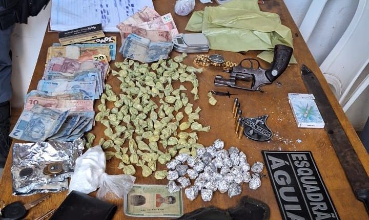 Durante a revista subsequente ao quintal da residência do homem suspeito, as autoridades apreenderam diversos itens ilícitos, incluindo um revólver Rossi, calibre 38, com cinco munições intactas; 104 papelotes de substância semelhante à cocaína; 47 trouxinhas de substância semelhante à maconha; 100 gramas de pasta base de cocaína; uma balança de precisão; dois papelotes de seda; sacolas plásticas; um rolo de papel alumínio; e uma agulha de tatuagem utilizada para a raspagem da pasta base de cocaína. Além das drogas e da arma de fogo, as autoridades também apreenderam R$ 1.838,00 em notas miúdas com os suspeitos.