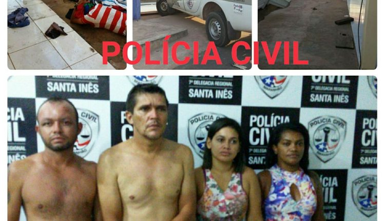 Polícia Civil do Estado do Maranhão, através do trabalho conjunto entre Superintendência Estadual de Investigações Criminais- SEIC e a Delegacia Regional de Polícia Civil de Santa Inês/7ªDRSI/SPCI (Capturas e Plantonista da 7ª DRSI e 2º DP/SI), prenderam no final da tarde de ontem (04), em flagrante delito na Cidade de Santa Inês os acusados Adailton José do Nascimento(46), ex Policial Militar; Airton César Viana Vasconcelos Júnior(31), Químico especializado em misturas químicas; Sheila Ferreira dos Santos(30) e Maria Alves Dos Santos(30) pelos crimes de organização criminosa armada, Porte ilegal e compartilhado de arma de fogo de uso restrito, Receptação, Tráfico ilícito de entorpecentes e adulteração de sinal identificador e outros crimes patrimoniais.