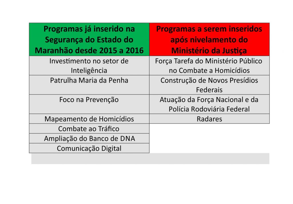 O plano prevê investimentos em capacitação policial, o que por aqui se tornou cotidiano, a exemplo da criação de novas superintendências de combate ao crime, como Senarc, Seccor e SHPP, do Batalhão Cosar, Batalhão Tiradentes, Centro Tático Aéreo e uma série de outras especializações; prevê o estreitamento das relações do sistema de segurança com a sociedade, o que já é fato no Maranhão através dos Conselhos Comunitários de Segurança.