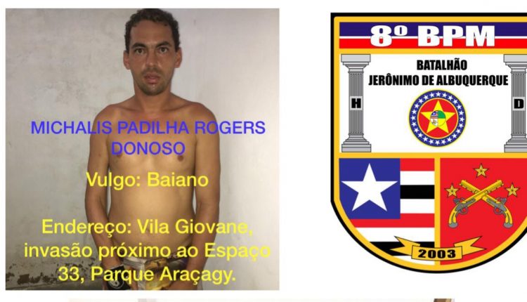 Na manhã desta segunda-feira (10), a Polícia Militar, através do 8ºBPM, conseguiu prender em flagrante um homem identificado como Michalis Padilha Rogers Donoso, conhecido como “Baiano”, (32), suspeito pelos crimes de tráfico de drogas e ameaça na Vila Giovane, uma comunidade nas proximidades do Parque Araçagy.