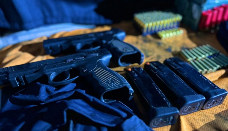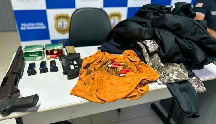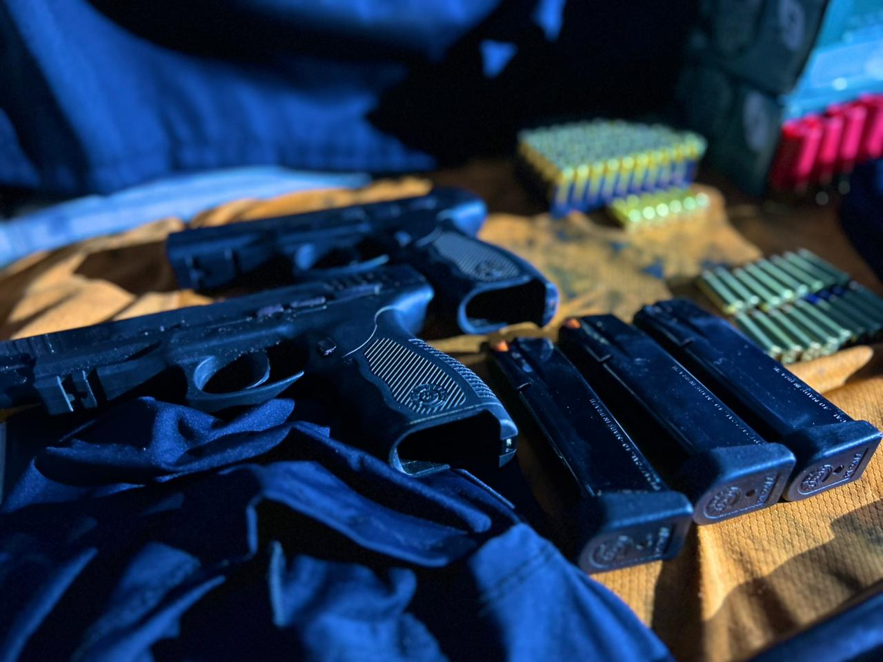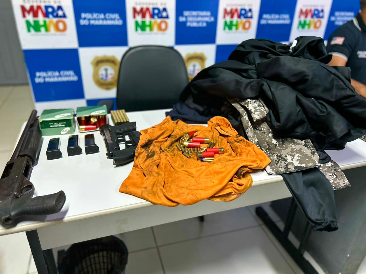 Com o suspeito, foram apreendidos: 1 espingarda calibre 12; 2 pistolas Taurus calibre .40 com numeração suprimida; 3 carregadores de pistola; 56 munições calibre .40; 50 munições calibre 12; 17 munições calibre .38; 6 camisas com identificação da Polícia Civil; 6 calças camufladas; 6 balaclavas; e 1 camisa térmica.