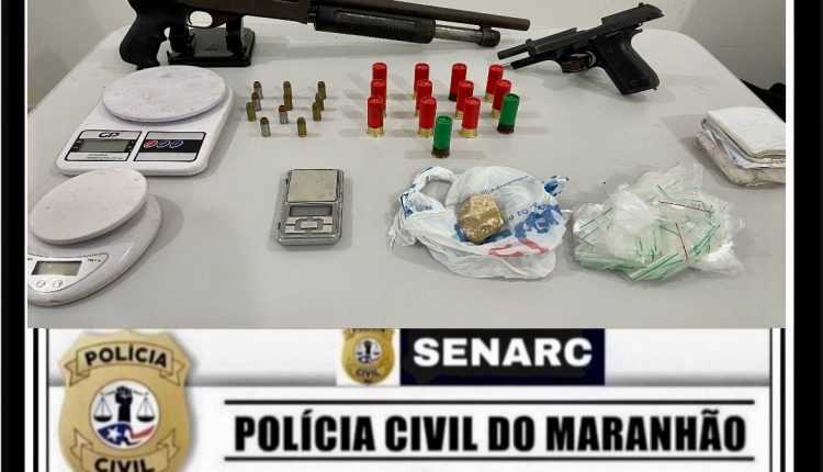 A Polícia Civil do Maranhão, através da SENARC, realizou, na tarde desta segunda-feira (23), a apreensão de uma escopeta calibre 12, uma pistola calibre 380, uma quantidade de crack, balanças de precisão e anotações.