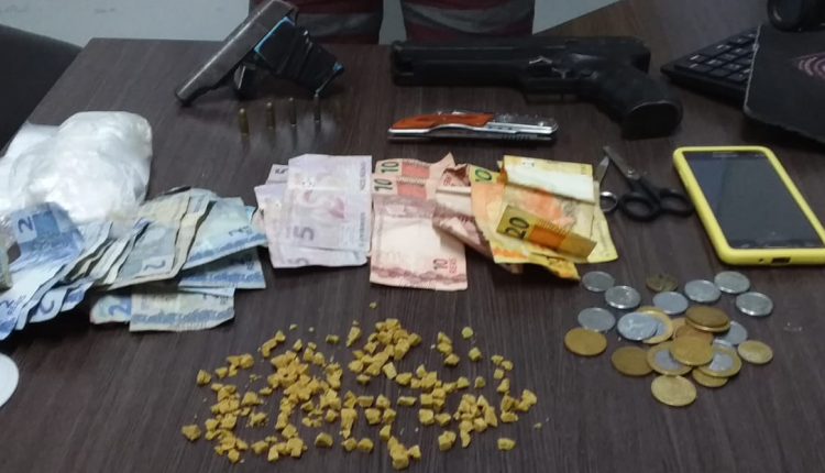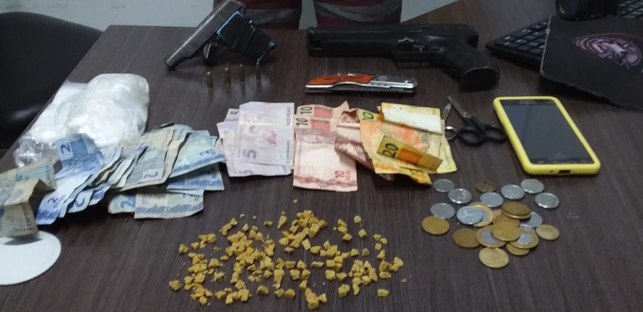 Na posse do indivíduo preso nesta terça os policiais civis encontraram 127 pedras de “crack”, uma arma de fogo marca Beretta, municiada; um artefato de ar comprimido assemelhado a arma de fogo, além de dinheiro em espécie e material plástico, comumente utilizado para embalagem do tipo de droga encontrada.
