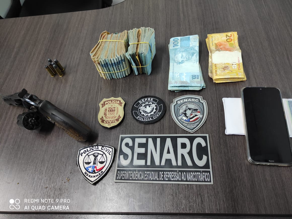 No endereço onde foram realizadas as buscas, os agentes policiais apreenderam 1(um) revólver calibre 38 devidamente municiado, a quantia de R$ 31.000,00 (trinta e um mil reais), uma pequena quantidade de maconha e mais um veículo de luxo, além de cartões bancários, joias e celulares.