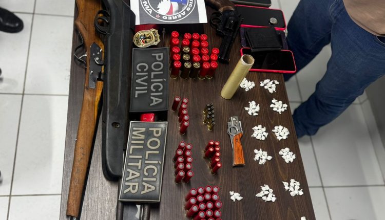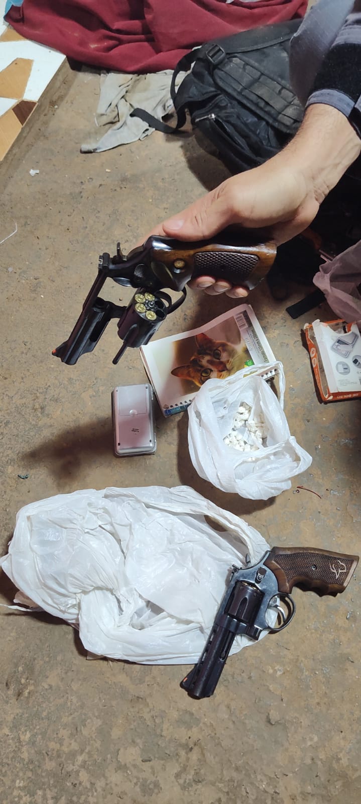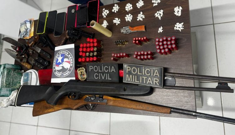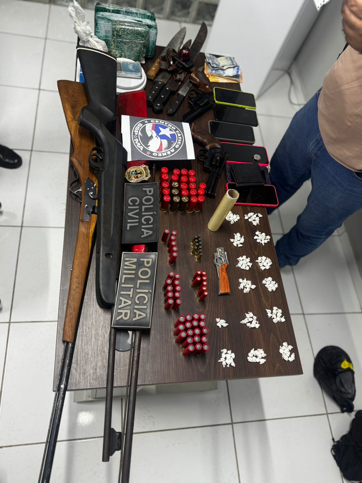 A maior apreensão ocorreu em uma residência no Centro do município, onde duas pessoas foram presas em flagrante, incluindo o autor de uma tentativa de homicídio. No imóvel, os policiais apreenderam cerca de 2,5 kg de crack, 134 porções de cocaína, dois revólveres calibre .38, três espingardas artesanais (uma delas adaptada para calibre .22), seis armas brancas, mais de 70 munições de diversos calibres, sete aparelhos celulares e dinheiro em espécie. Também foram encontrados pássaros silvestres, caracterizando crime ambiental.