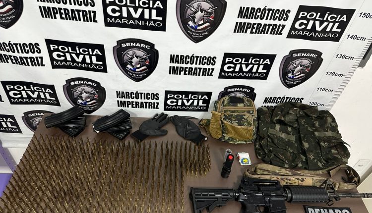 “Nossa equipe da Denarc de Imperatriz realizava uma operação para apreensão de drogas e cumprimento de mandado de prisão contra um foragido da Justiça. Durante a vistoria ao veículo, encontramos o fuzil americano calibre 5.56, aproximadamente 500 munições intactas, roupa camuflada, lanterna tática, entre outros itens. Material típico de preparo para ação criminosa, como roubo a banco”, informou o delegado Éderson Martins, titular da Superintendência Estadual de Prevenção e Repressão ao Narcotráfico (Senarc).