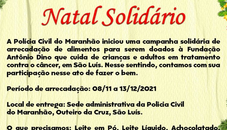 A Polícia Civil do Maranhão, visando levar um pouco mais de esperança aos pacientes em tratamento de combate ao câncer do Hospital do Câncer Aldenora Belo, lançou, no último dia 8 de novembro, a campanha intitulada “Natal Solidário”, com o objetivo de arrecadar alimentos que serão entregues à Fundação Antônio Dino que mantém o hospital.