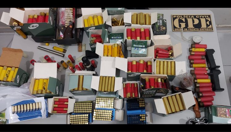90 cartuchos de munição calibre 12, 8 munições de calibre 16, 107 munições de calibre 20, 7 munições de calibre 28, 50 munições de calibre 32, 147 munições de calibre 36, 35 munições de calibre 38, 42 munições de calibre 32, 224 munições de calibre 22, totalizando 710 munições intactas, e além de 42 cápsulas de calibre 36, 86 cápsulas de calibre 40, 54 cápsulas de calibre 20, 35 cápsulas de calibre 28 e 51 cápsulas de calibre 32, totalizando 268 cápsulas para recarga de munição, e 700 espoletas.
