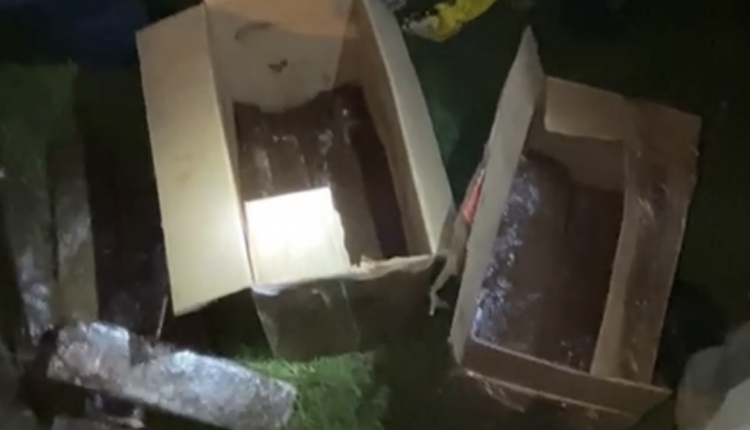 Com o auxílio do cão farejador BARUK, foram encontradas duas caixas contendo “22 tabletes de maconha” que estava no bagageiro do ônibus.