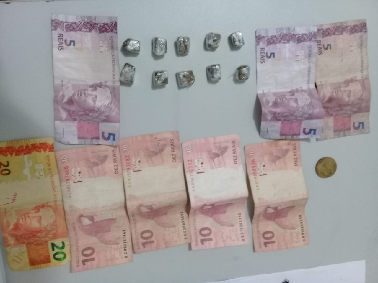 Dentro do pacote foi encontrado 10 embalagens individualizadas contendo maconha; dinheiro trocado e aparelho celular.