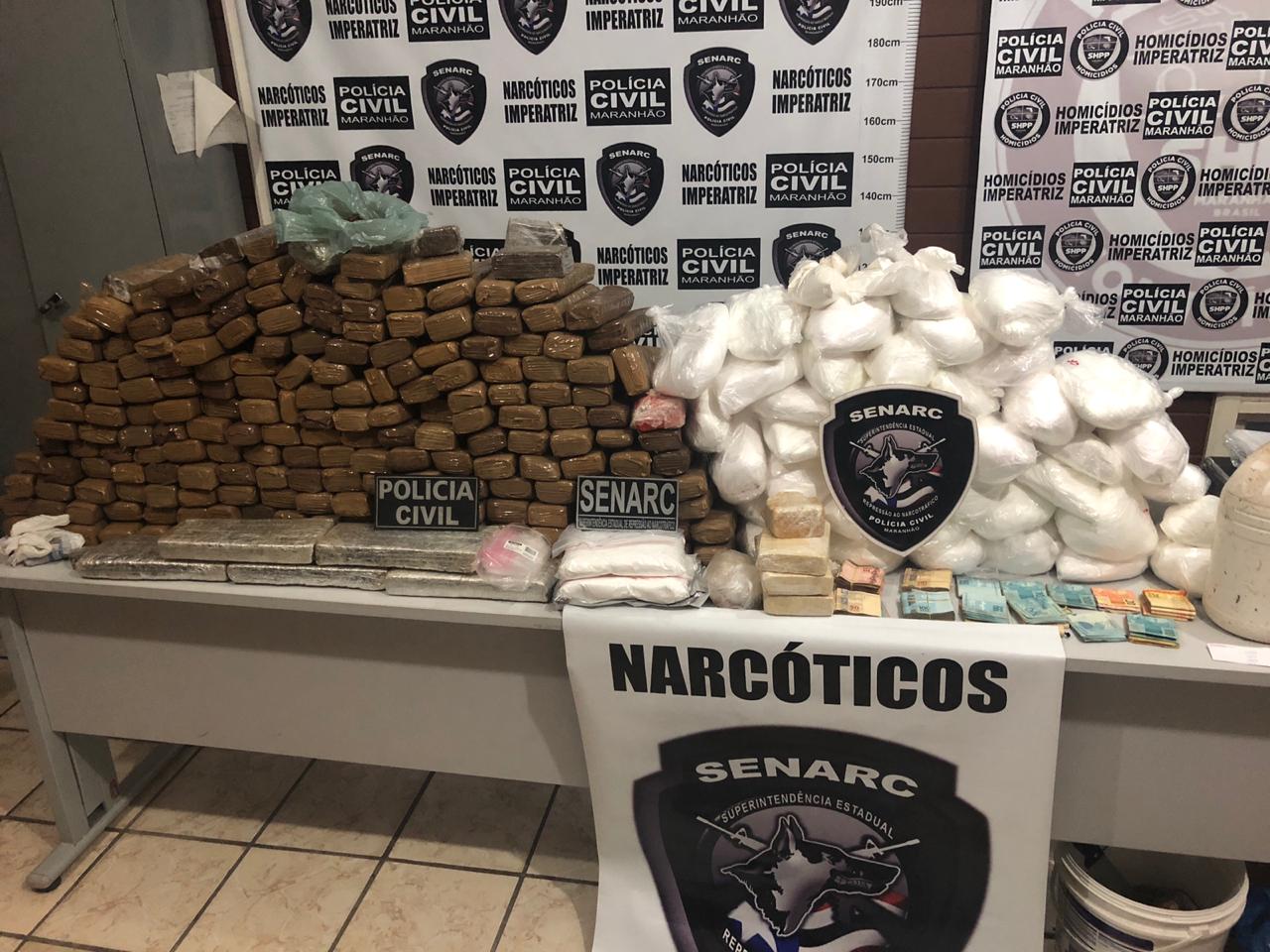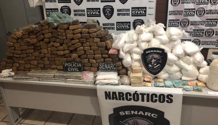 Uma operação desencadeada pela Polícia Civil do Maranhão por meio da Delegacia de Repressão ao Narcotráfico de Imperatriz (Senarc), resultou na apreensão de uma grande quantidade de entorpecentes em Imperatriz-MA, onde foram apreendidos aproximadamente 213kg de drogas. Foram encontrados 164kg de maconha, 3,6kg de crack e aproximadamente 45,4kg de pó branco, com características de ser insumo de cocaína. Na ação foi preso ainda, o acusado Caetano Amancio Pereira, e um valor em dinheiro de R$ 19.500,00.