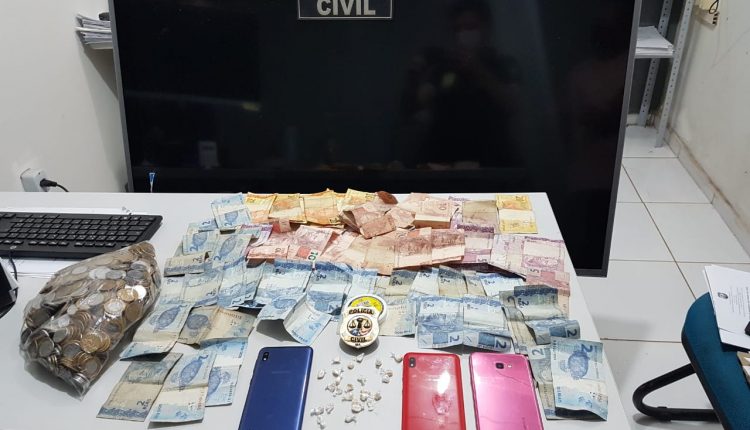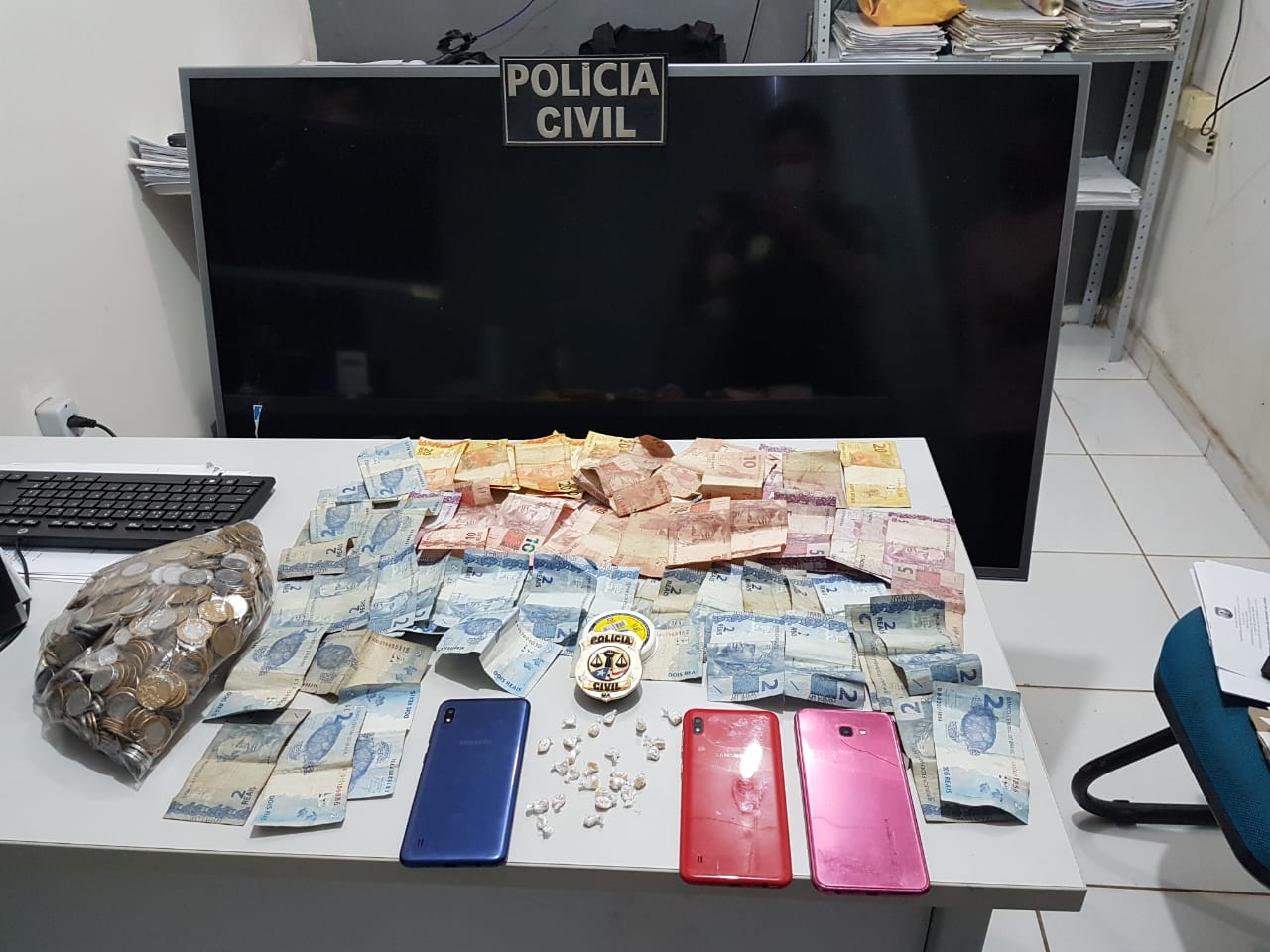 Durante a prisão, foram encontrados, em poder das pessoas flagranteadas, porções de drogas já embaladas para venda e uma quantia em dinheiro trocado, situação comum nesse tipo de comércio.