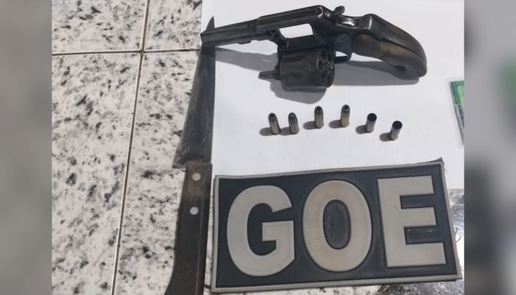 Os policiais receberam informações sobre dois disparos de arma de fogo na praça São Benedito, de imediato os militares seguiram ao destino informado e encontraram o suspeito. Após abordagem identificaram a arma de fogo, um revólver calibre 32 com quatro munições intactas e duas munições deflagradas, além de uma faca junto ao homem.