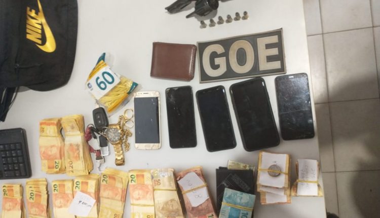 Um caminhão modelo Wolkswagem, de cor prata; caminhão modelo Mercedes 1620, na cor azul e placas HTX1241; um veículo modelo Fiat argo, de cor branca, placas RFK2g27; uma D20, de cor vermelha e placas JDS1508; 01 revolver modelo 38 de numeração: kb409548, com 06 municões intactas. 01 pulseira dourada; 02 anéis dourado; 01 cinto; 04 celulares; 1000 caixas de cigarro da marca Record e a quantia de R$ 12.747,00 (doze mil setecentos e quarentena e sete reais).