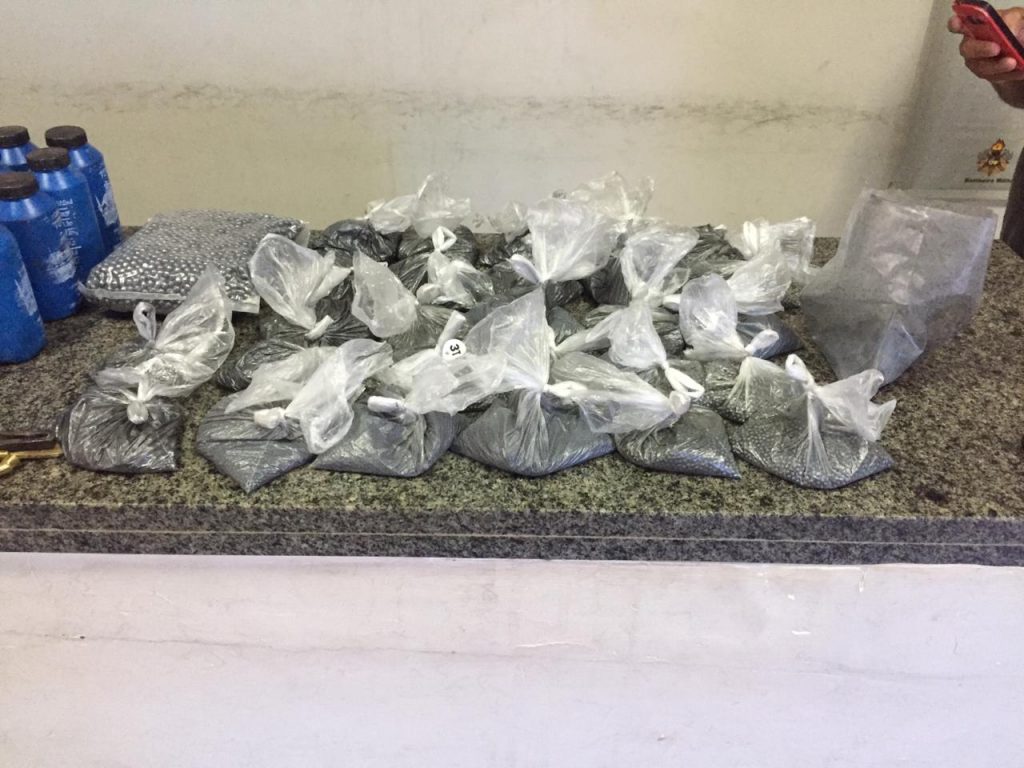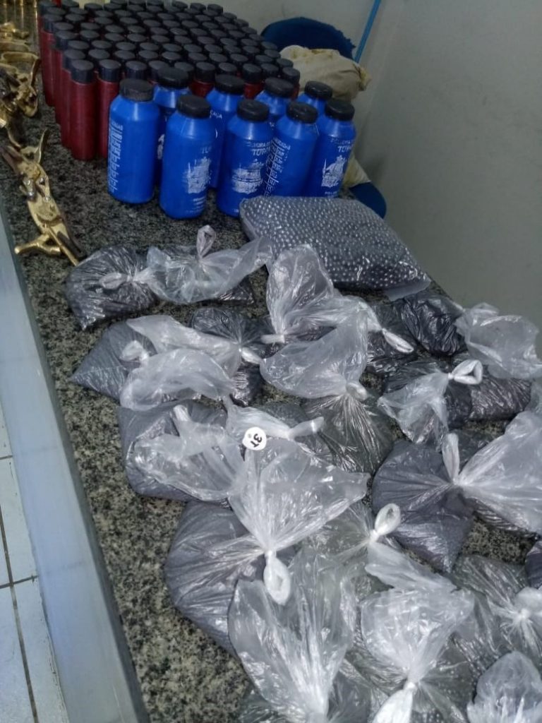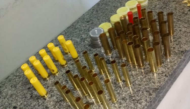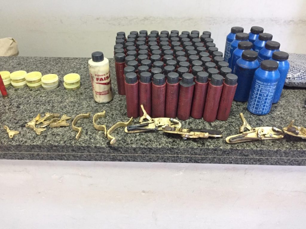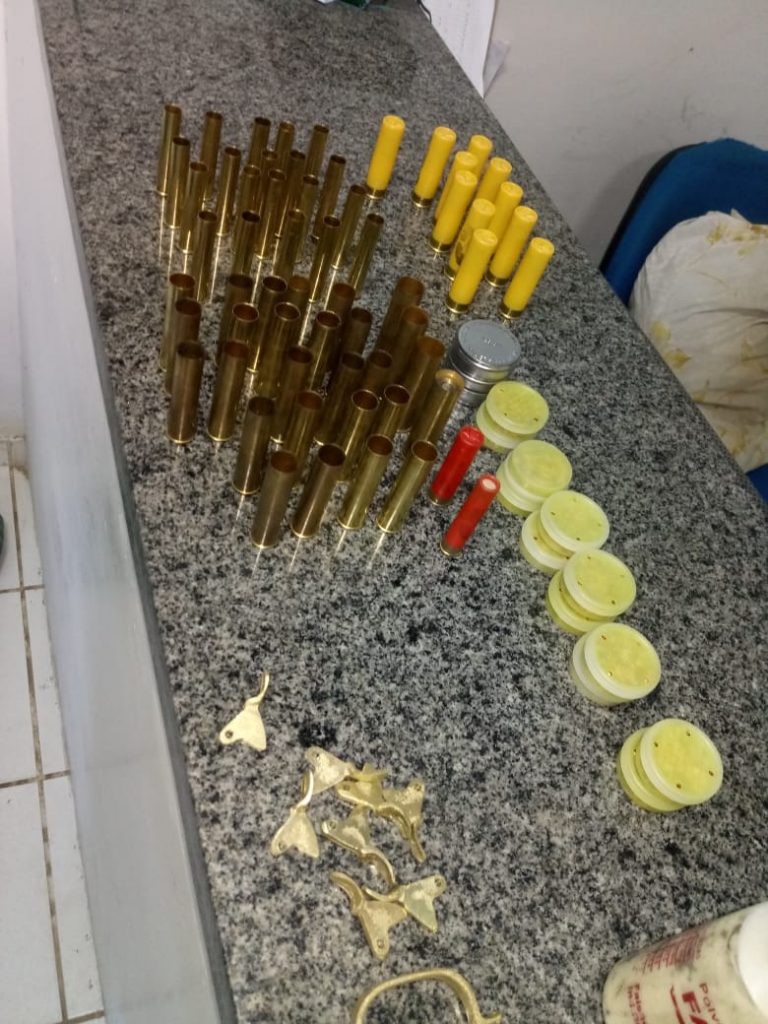 Durante uma busca no local, os policiais encontraram 11 munições cal. .20, duas munições calibre .32, uma munição calibre .36, quatro cartuchos descarregados calibre .20, 23 cartuchos descarregados calibre .32, 20 cartuchos descarregados calibre .36, 15 estojos de espoletas, 86 tubos de pólvora preta, 10 tubos de pólvora branca, 28 sacos contendo 1/2kg de chumbos cada, um saco contendo 05kg de chumbo, 04 mesas de bate bucha, 03 guardas mato e 08 gatilhos de bate bucha.