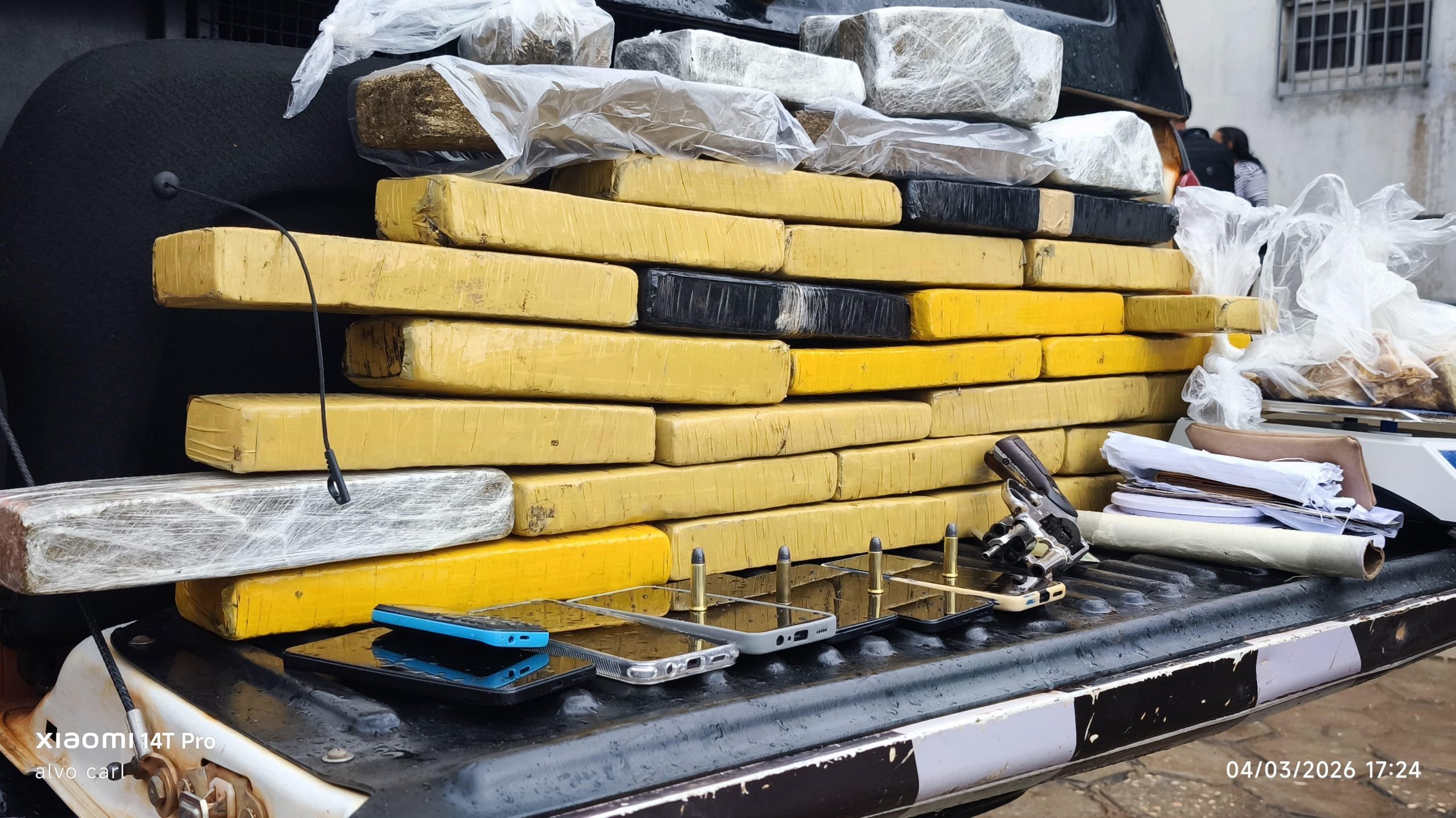 Durante a ação, os policiais também apreenderam um revólver calibre .38 com munições, balança de precisão, material utilizado para embalar drogas, aparelhos celulares, anotações relacionadas à comercialização do tráfico e dois veículos, sendo uma motocicleta e um Renault Duster caracterizado como táxi, supostamente utilizado para transportar a droga sem levantar suspeitas.
