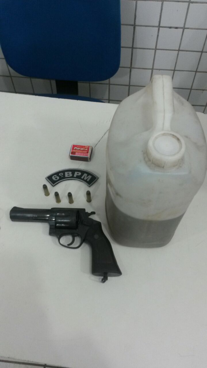 01 revólver calibre 38 com 04 munições intactas da marca Rossi numeração raspada pertencente a PM-MA, 01 Recipiente com aproximadamente 03 litros de gasolina, 01 caixa uma caixa fósforo. Uma motocicleta Honda CG Fan 125 de cor preta placa NNH 0917.