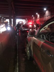 Em resposta ao ato e por não saber se dentro do veículo se encontravam pessoas inocentes ou uma possível vitima sequestrada na mala deste, foram realizados disparos contra os pneus traseiros do veículo em fuga, que foram perfurados, obrigando que o veículo parasse dentro do túnel da Cohama, onde foi dada ordem para que todos descessem do carro, que foram abordados e revistados e dentro do veículo foram encontrados materiais apreendidos.